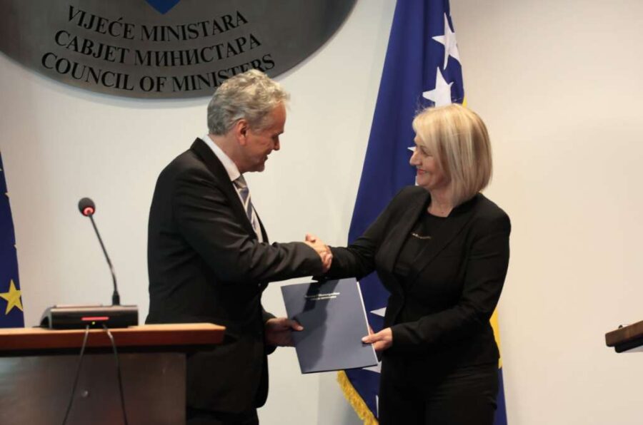Predsjedateljica Vijeća ministara Bosne i Hercegovine Borjana Krišto uručila je danas šefu Izaslanstva EU i specijalnom predstavniku EU u BiH veleposlaniku Johannu Sattleru potpisani Sporazum o financiranju Godišnjeg akcijskog plana u prilog Paketu za energetsku podršku za zapadni Balkan u korist BiH za 2023. godinu između Europske unije i BiH.