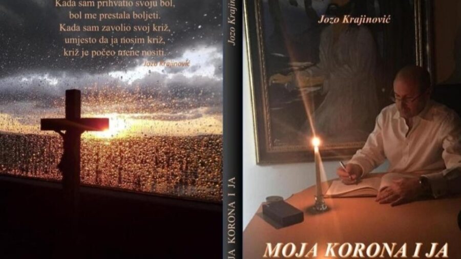 Ljudske i neljudske odnose Krajinović je najbolje opisao u autobiografskoj noveli Moja korona i ja. O čemu se zapravo radi? Tom relativno mladom čovjeku, rodom iz Ljubuškog, zdravom i jakom, naglo pozlije i završi u jednoj zagrebačkoj bolnici. Put od stana do bolnice je strašan i oslikava stanje u našemu društvu i zdravstvu, a još bolje predočuje to stanje i djelovanje u bolnici koju Krajinović opisuje i, katkad mi se pričinja, da neke bitne događaje prešućuje. Mene je posebno zagolicalo ono što je prešutio, što mu je uradila jedna postarija liječnica kad joj je priznao da se nije cijepio. Zamislite, pljunula ga je. To je Krajinović prešutio u svojoj priči, što ja, da se meni dogodilo, moram priznati, ne bih prešutio. Ova nemila scena u bolnici i još neke zorno govore o Krajinoviću kao vjerniku i visoko moralnu čovjeku, koji živi svoju vjeru i u nekim pričama izravno se obraća Bogu poput starozavjetnih patrijarha i proroka.