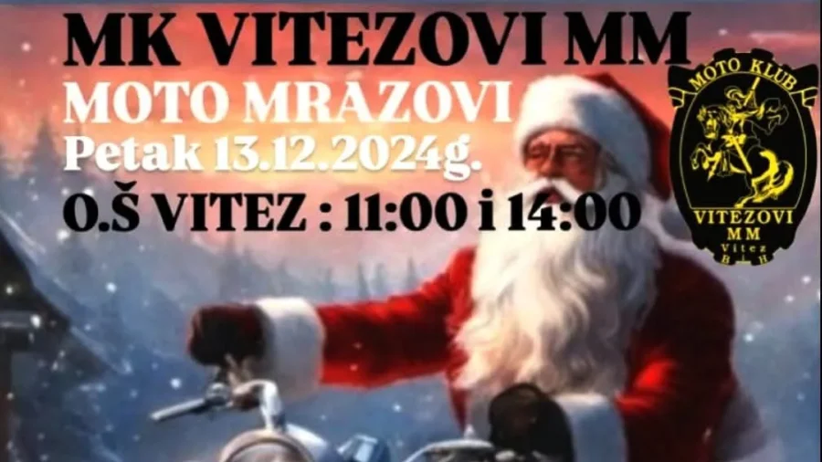 Članovi kluba će u petak, 13. prosinca s veselim raspoloženjem, kako oni jedino i znaju, obući crvena odijela, staviti kapice na glave, sjesti na motore i provozati se Vitezom u ulozi prepoznatljivih Moto mrazova i već od 11:00 i u drugom terminu u 14:00 sati se pojaviti ispred Osnovne škole ,,Vitez”. Kao i prethodnih godina, odlučili su posjetiti jednu školu na području Viteza pa je ovoga puta ponovno na red došla OŠ ,,Vitez” i to najmlađi ove škole. Iz Moto kluba najavljuju kako su spremili paketiće za mališane, a samo dan poslije će u svojim prostorijama podijeliti paketiće za djecu članova kluba.