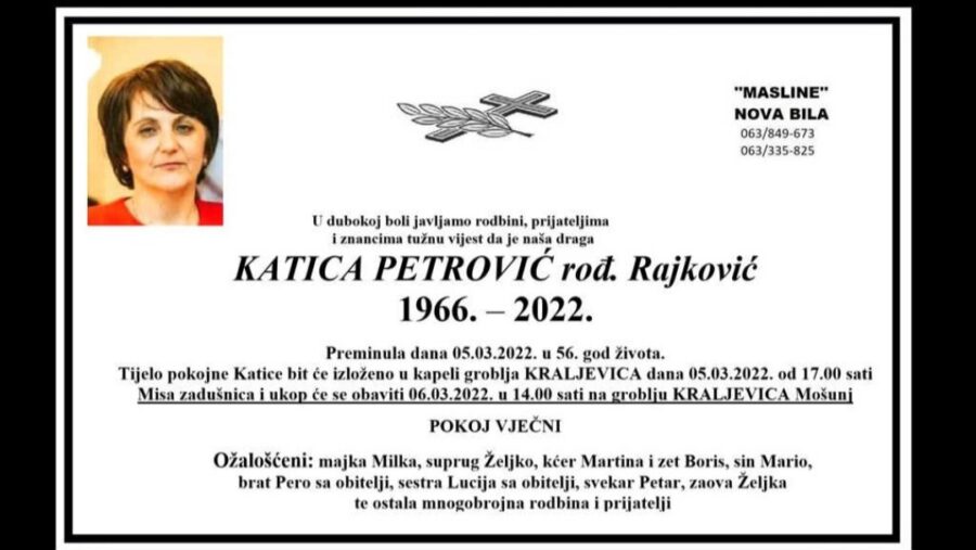 Misa zadušnica i posljednji ispraćaj će biti 06.03.2022. godine u 14,00 sati na groblju Kraljevica u Mošunju.