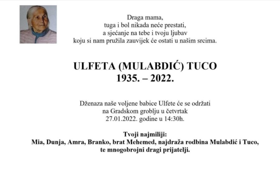 Posljednji ispraćaj Ulfete bit će u četvrtak, 27. siječnja na Gradskom groblju u Vitezu u 14:30.