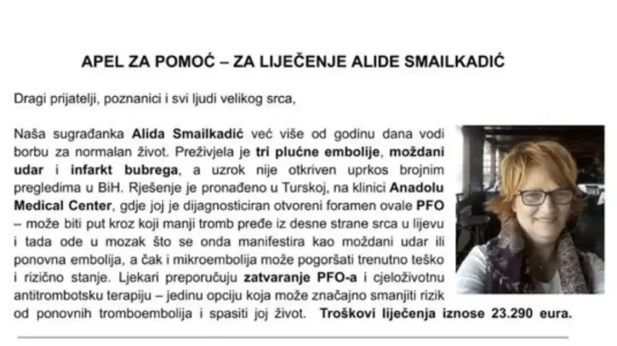 Alida je u posljednjih godinu dana preživjela tri plućne embolije, moždani udar i infarkt bubrega. Unatoč brojnim pokušajima dijagnostike i liječenja u Bosni i Hercegovini, uzrok ovih ozbiljnih zdravstvenih problema nije utvrđen. Spas i nada pronađeni su u Turskoj, u klinici Anadolu Medical Center, gdje joj je dijagnosticiran otvoreni foramen ovale (PFO) – defekt na srcu koji omogućava da krvni ugrušci pređu u mozak, izazivajući moždane udare i embolije. Jedina šansa za Alidino izlječenje je operacija zatvaranja PFO otvora, kojom bi se spriječile nove komplikacije i omogućio povratak normalnom životu. Troškovi liječenja, koji uključuju operaciju, dijagnostičke preglede i smještaj, iznose 23.290 eura – iznos koji njena obitelj ne može sama pokriti.
