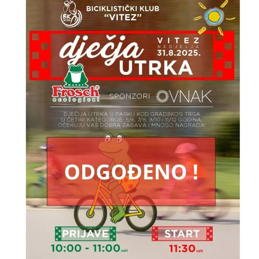 Biciklistički klub „Vitez“ obavještava da je planirana dječja biciklistička utrka, koja se trebala održati u nedjelju 31. kolovoza 2025. godine u parku kod Gradskog trga, odgođena zbog vremenskih neprilika i kiše.
