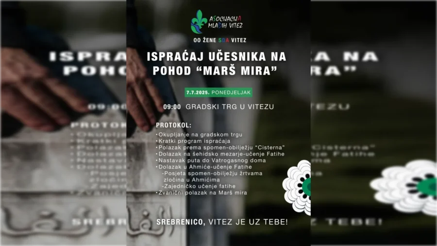 U ponedjeljak, 7. srpnja 2025. godine u 9:00 sati, na Gradskom trgu u Vitezu bit će upriličen ispraćaj sudionika na pohod “Marš mira”, u organizaciji Asocijacije mladih i OO Žene SDA Vitez.