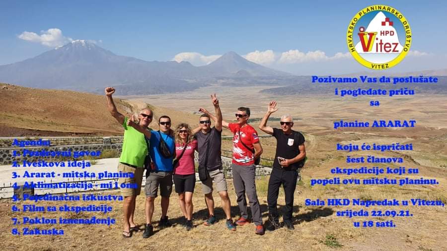 Dana 22. rujna 2021. godine u prostorijama HKD ,,Napredak” podružnica Vitez s početkom u 18:00 sati šest planinara pričaju iskustvo pohoda na Ararat.