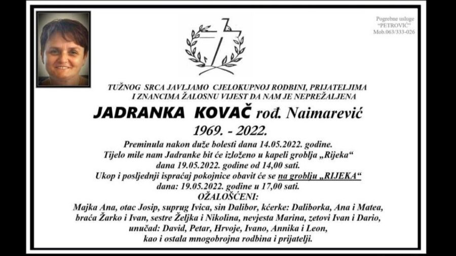 Cjelokupnoj obitelji, prijateljima i poznanicima obitelj javlja kako je Jadranka Kovač, rođena Naimarević preminula nakon duže bolesti.