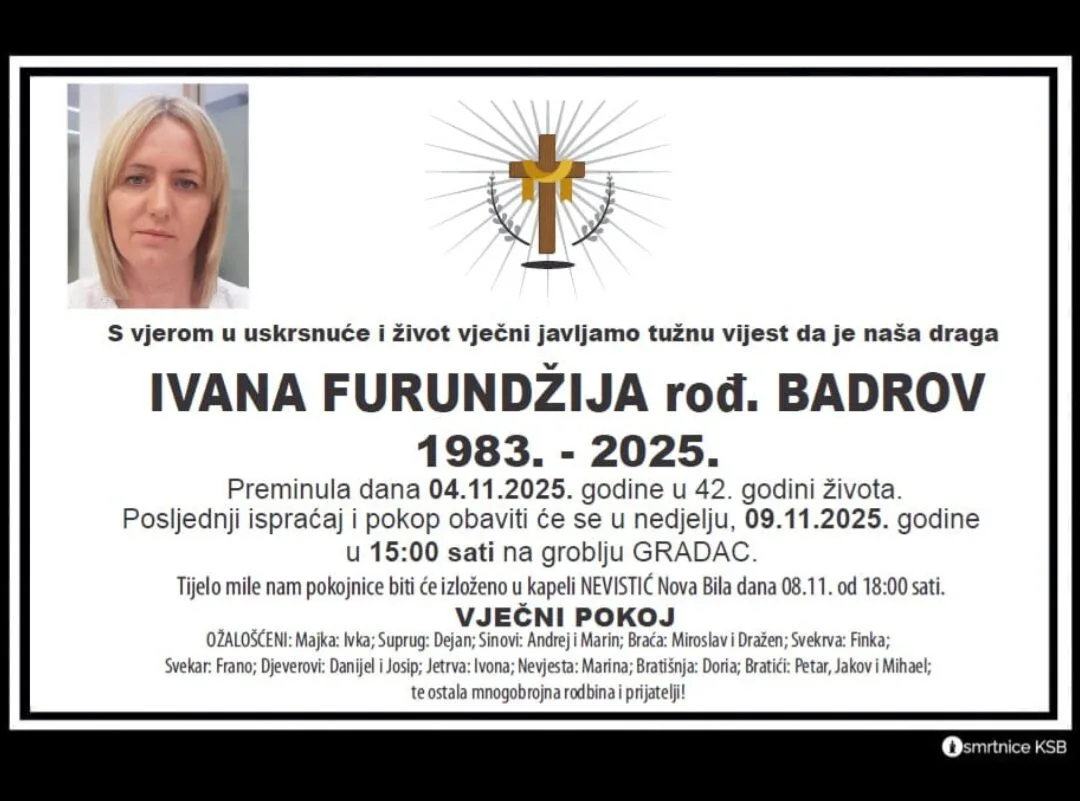 S vjerom u uskrsnuće i život vječni, javljamo tužnu vijest da je Ivana Furundžija rođ. Badrov preminula u 42. godini života.