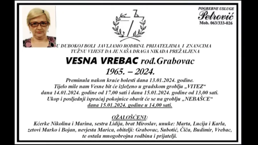 Vesna Vrebac rođena Grabovac (1965.-2024.) preminula je nakon kraće bolesti dana 13.01.2024. godine.
