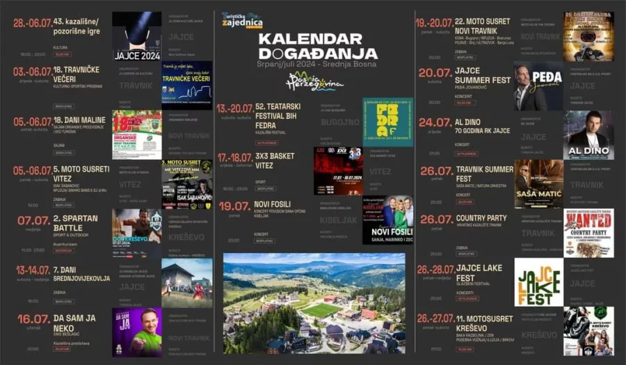 Turistička zajednica SBŽ/ŽSB donosi kalendar najvažnijih događaja za srpanj 2024. godine. Kao i prethodnih godina, i u 2024. godini organizirane su brojne manifestacije i događaji na gotovo cijelom području Središnje Bosne.