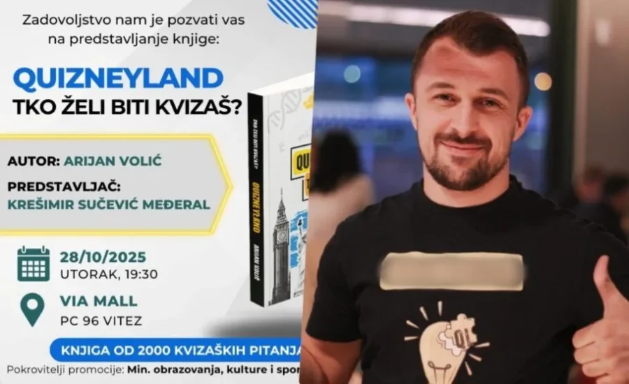 Promocija knjige „QuizneyLand – Tko želi biti kvizaš“ održat će se večeras, 28. listopada 2025. godine, u Via Mallu (Vitez, bivši Franšizni centar).