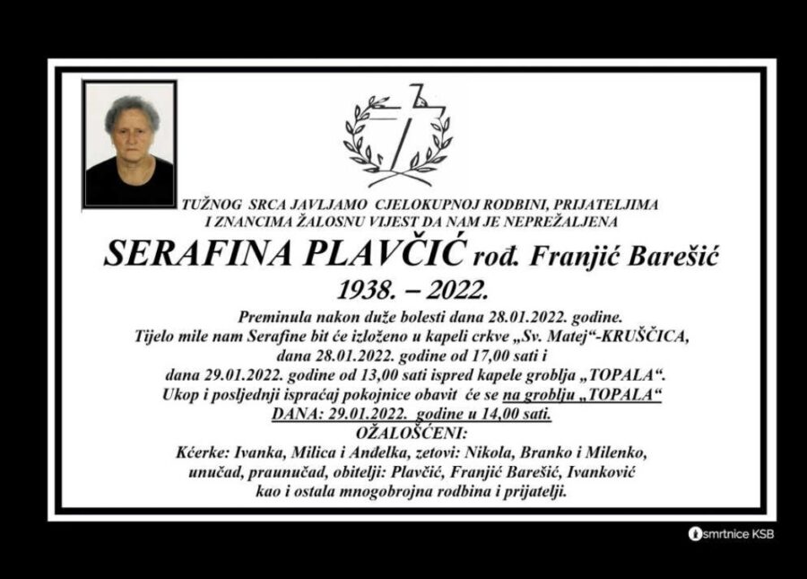 Nakon duže bolesti dana 28. siječnja ove godine u 84. godini preminula je Sarafina Plavčić. Inače, Sarafina je majka pokojnog Josipa Plavčića Đokca zapovjednika III. satnije, I. bojne Viteške brigade HVO-a.