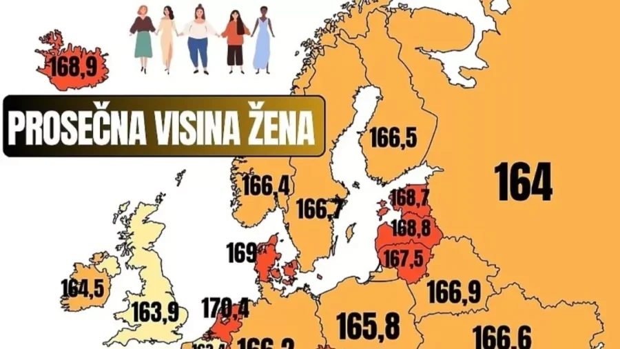 Zemlje s najvišim ženama su na mapi označene tamnonarančastom nijansom. Najniže su označene svijetložutom nijansom. Najniže žene žive u Sjevernoj Makedoniji prema mapi gdje je prosjek 160 centimetara, a slijedi Portugal sa 161,2 te Italija sa 161,8 centimetara. Bosna i Hercegovina je i prema visini muškarca pri vrhu globalne liste, a nalazi se na šestom mjestu. Globalna mreža World of Statistics ranije je objavila listu prosječne visine muškaraca po zemljama svijeta, a zanimljivo je da su na prvom mjestu Nizozemci s visinom od 182,54 centimetra.