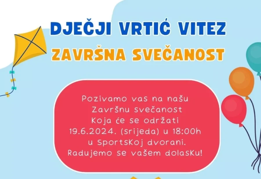 Iz Javne ustanove Dječji vrtić Vitez pozivaju na završnu svečanost za pedagošku 2023/2024. godinu. Ovaj poseban događaj bit će održan u srijedu, 19.6.2024. s početkom u 18:00 u Gradskoj sportskoj dvorani Vitez.