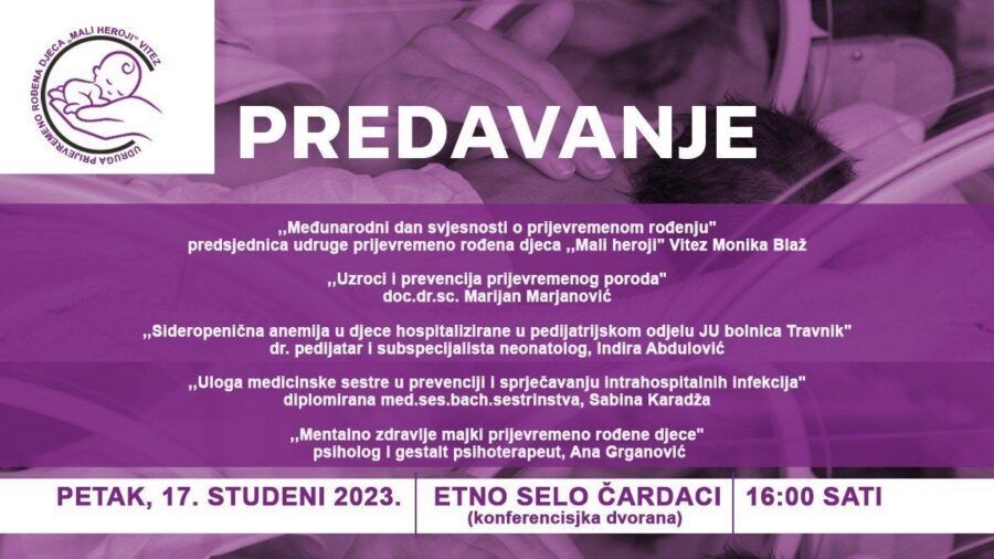 Udruga prijevremeno rođena djeca Mali heroji organizira predavanje, koje će bit održano u Etno selu Čardaci, u petak, 17. studenog s početkom od 16:00.