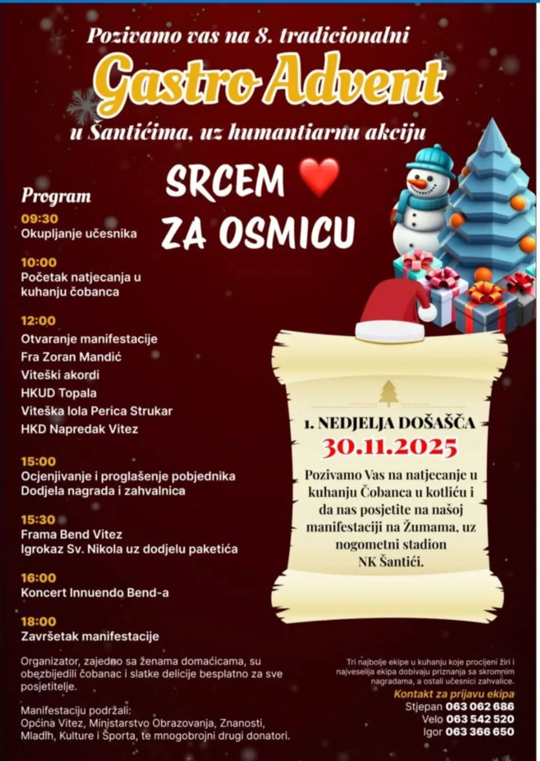 U nedjelju, 30. studenoga 2025. godine, na Žumama uz nogometni stadion NK Šantići, održat će se 8. tradicionalni Gastro Advent u Šantićima, ove godine pod sloganom „Srcem za Osmicu“.