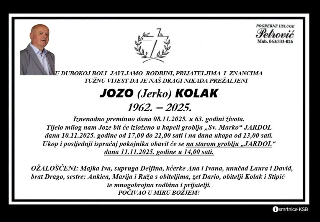S tugom javljamo da nas je iznenada napustio Jozo (Jerko) Kolak u 63. godini života. Ožalošćena obitelj, rodbina i prijatelji opraštaju se od dragog Joze.