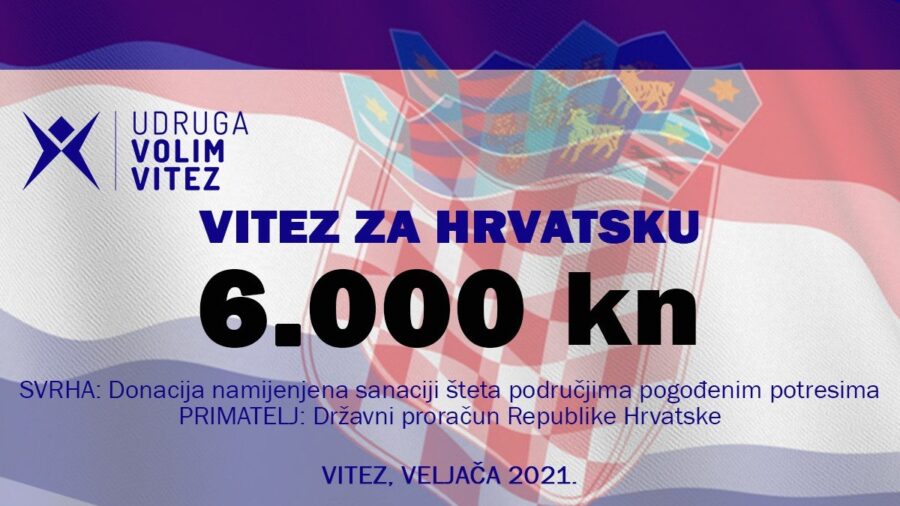 U sklopu dobrotvorne akcije “Vitez za Hrvatsku” koju vodi Udruga Volim Vitez u suradnji s nizom pravnih i fizičkih osoba izvršena je uplata financijske donacije za potresom pogođena područja Republike Hrvatske.