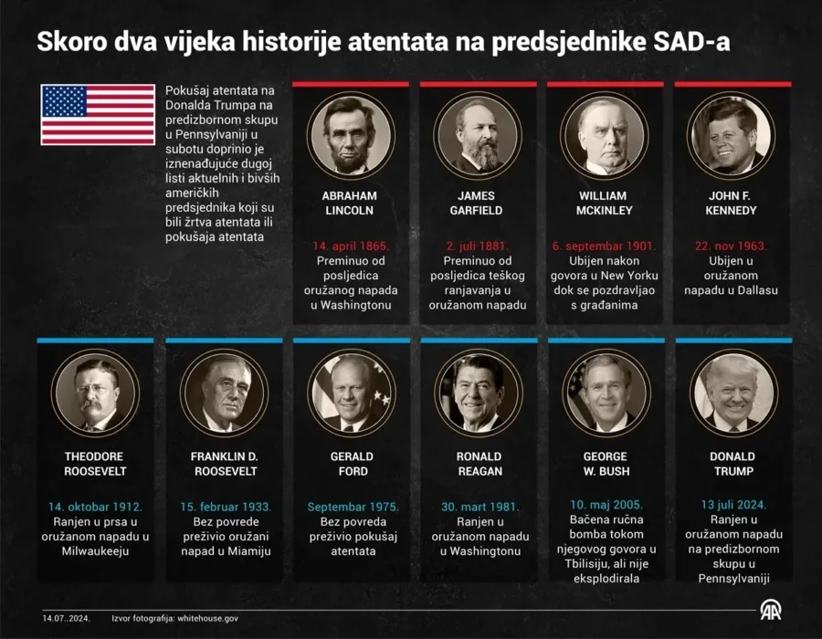 Atentat na Donalda Trumpa na predizbornom skupu u Pennsylvaniji u subotu doprinio je iznenađujuće dugačkoj listi aktuelnih i bivših američkih predsjednika koji su bili žrtve atentata ili pokušaja ubojstava kroz historiju Sjedinjenih Američkih Država.